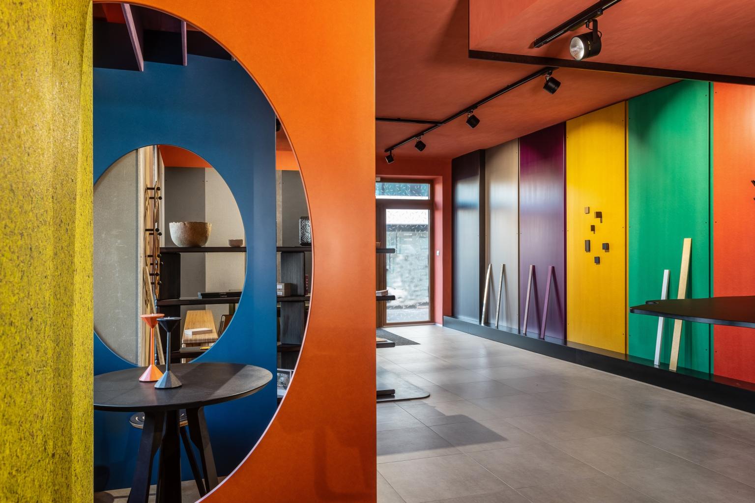 Interiér showroomu Materiálovna je unikátní 3D vzorník deskových materiálů, do kterého můžete doslova vstoupit. Ocitnete se v prostoru, který nabízí nejen architektům několik pracovních zón pro setkání s klienty. Můžete zde procházet desítky vzorků deskových materiálů. Vzorníky nejsou řazeny dle výrobce, ale dle designu povrchu a jejich ideálního použití na stěně, podlaze či nábytku. Materiálovna je laboratoř pro plánování vašeho projektu, který zde můžete prezentovat i velké skupině lidí.