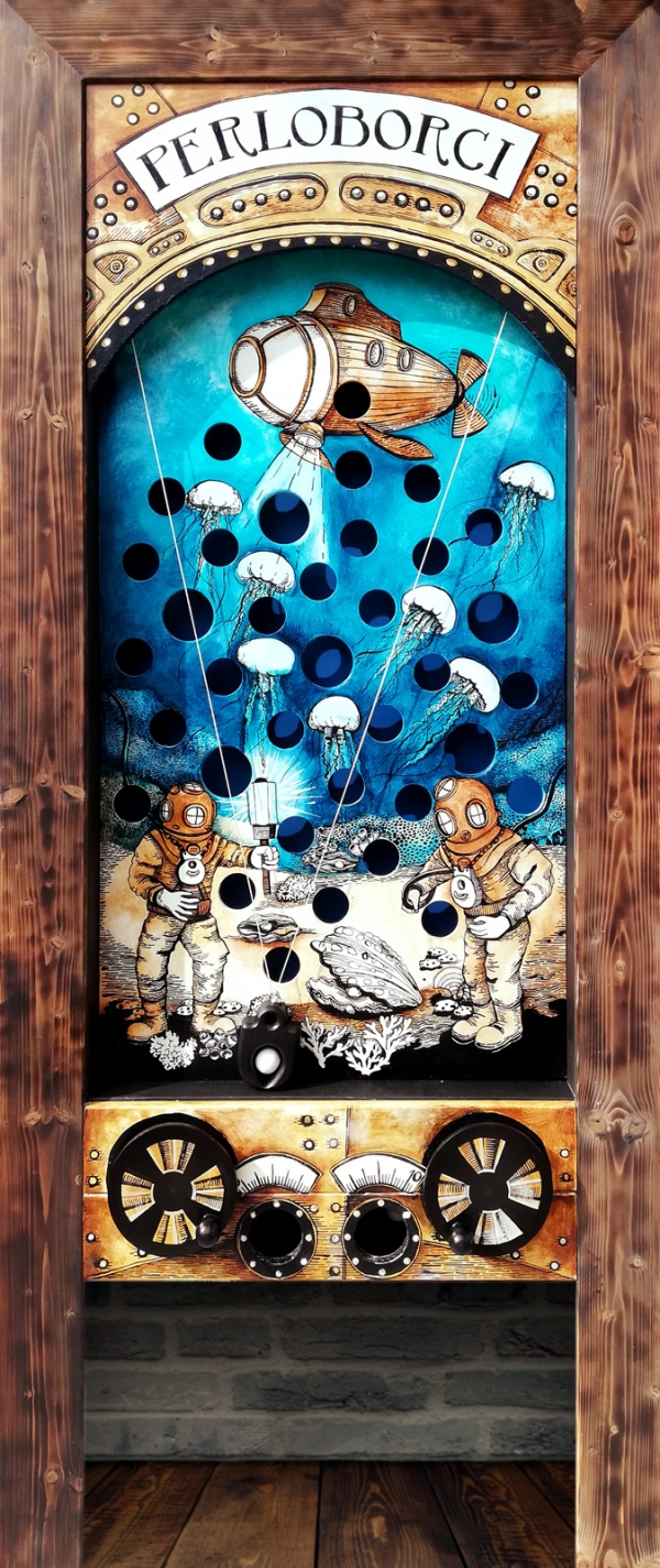 Digitální projekty byly zábava, ale postupem času jsme začali čím dál víc tíhnout k práci s materiálem a pouštět se do realizací výtvarných prostorových objektů - atrakcí pro pobavení nás, našich dětí, kamarádů a postupně i širšího okolí. Těší nás, že nejsme jediní, koho i v době 4. průmyslové revoluce baví ručně malované kulisy, vyřezávané flintičky, mechanická hejblátka, či jiná další oldschool unplugged zábava. Naše tvorba se proto přehoupla i přes vrata našeho domu a můžete ji vidět na různých soukromých, či komunitních akcích, festivalech, či jiných kulturně společenských veselicích. V zimním období nově také jako dlouhodobou interaktivní instalaci např. v Zámecké lékárně v Třeboni nebo v současné době na půdě zámku Muzea v Roztokách u Prahy.
